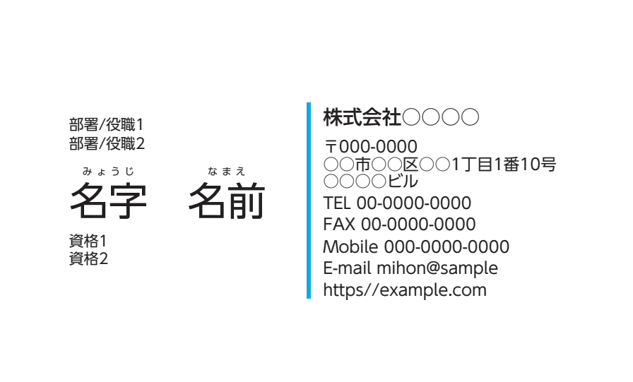 ラインを挟んだ左側には、氏名とその上部に「部署/役職」を2パターン、下部に資格などを2パターン配置可能となります。